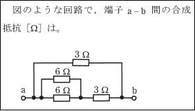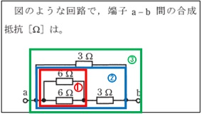 パターン2をちょっと変形させただけの問題です。これもどちらかの小さい並列接続の合成抵抗から順に求めていきます。このパターンも1点にしましょう。