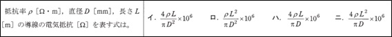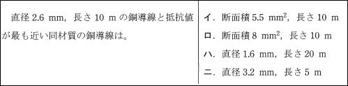 断面積はおよそ5.3mm2ですので、あとは長さが等しいものがあれば一番近いものになりますので、答えは「イ」となります。