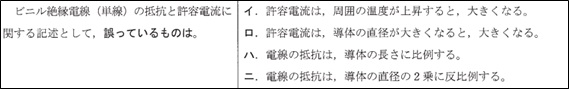 で、答えも「許容電流は、周囲の温度が上昇すると、大きくなる。」という選択肢が間違いというものです。