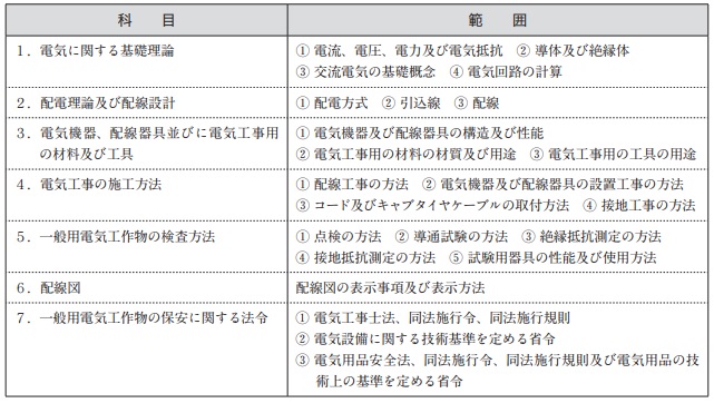 筆記試験の科目と範囲は次の表のとおりです。